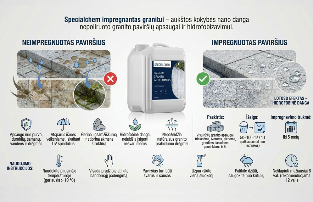 Skirtas visų rūšių granito apsaugai: granito trinkelėms, tvoroms, sienoms, grindims, fasadams, paminklams ir kt.