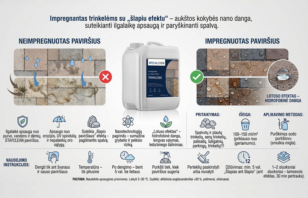 Produktas skirtas trinkelių impregnavimui, suteikiantis „šlapio paviršiaus“ efektą – pagilinantis spalvą. Speciali formulė užtikrina ilgalaikę apsaugą nuo purvo, vandens ir dėmių. Be to, nanodalelių dėka gaunamas STAYCLEAN paviršius, kurį lengva valyti. Žiemą tai palengvina ledo ir sniego pašalinimą. Hidrofobinis, apsaugo nuo purvo ir druskų. Atsparus UV spinduliams ir nepalankioms oro sąlygoms. Sumažina grybelio ir pelėsio riziką. Padengtas paviršius tampa atsparus purvui, vandeniui ir nešvarumams.